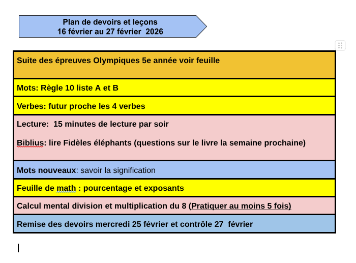 Je vous remettrai à la rencontre de lundi cette semaine, le résultat du test de lecture réalisé par l’orthopédagogue pour la fluidité (vitesse, ponctuation, exactitude). Beaucoup d’efforts seront mis pour améliorer la fluidité en ce début d’année. Il y a toujours 15 minutes de lecture chaque soir dans les devoirs.