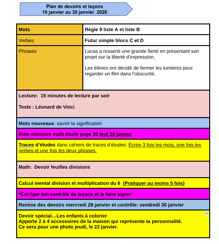 Je vous remettrai à la rencontre de lundi cette semaine, le résultat du test de lecture réalisé par l’orthopédagogue pour la fluidité (vitesse, ponctuation, exactitude). Beaucoup d’efforts seront mis pour améliorer la fluidité en ce début d’année. Il y a toujours 15 minutes de lecture chaque soir dans les devoirs.